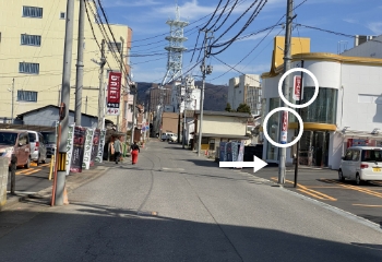 ⑤タイガー駐車場様を過ぎた十字路を右折。電柱の看板にホテルニューパレスの文字あり。